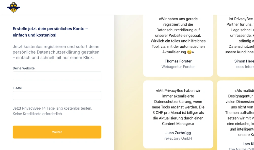 Vertraue auf PrivacyBee, um deine Website rechtlich sicher und stets aktuell zu halten. Starte jetzt und erlebe, wie einfach Datenschutz sein kann. Nutze unsere kostenlose 14-Tage-Testphase und überzeuge dich selbst von den Vorteilen unserer Lösung.