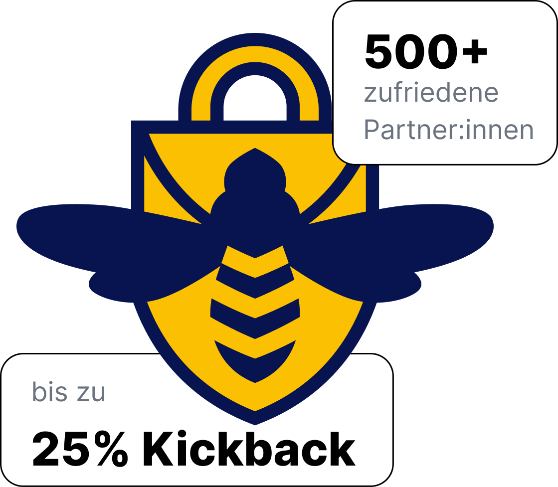 Mit bis zu 25% jährlichem Kickback verdienst du automatisch mit. Zusätzlich kannst du Setup und Betreuung von PrivacyBee als eigenen Service deinen Kund:innen anbieten.